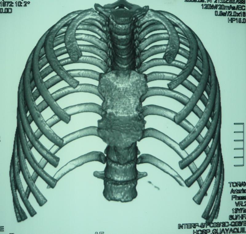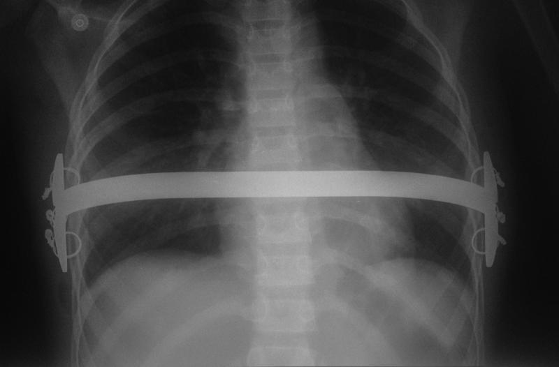 Se implantó barra metalica de compresión interna con fijación costal bilateral.